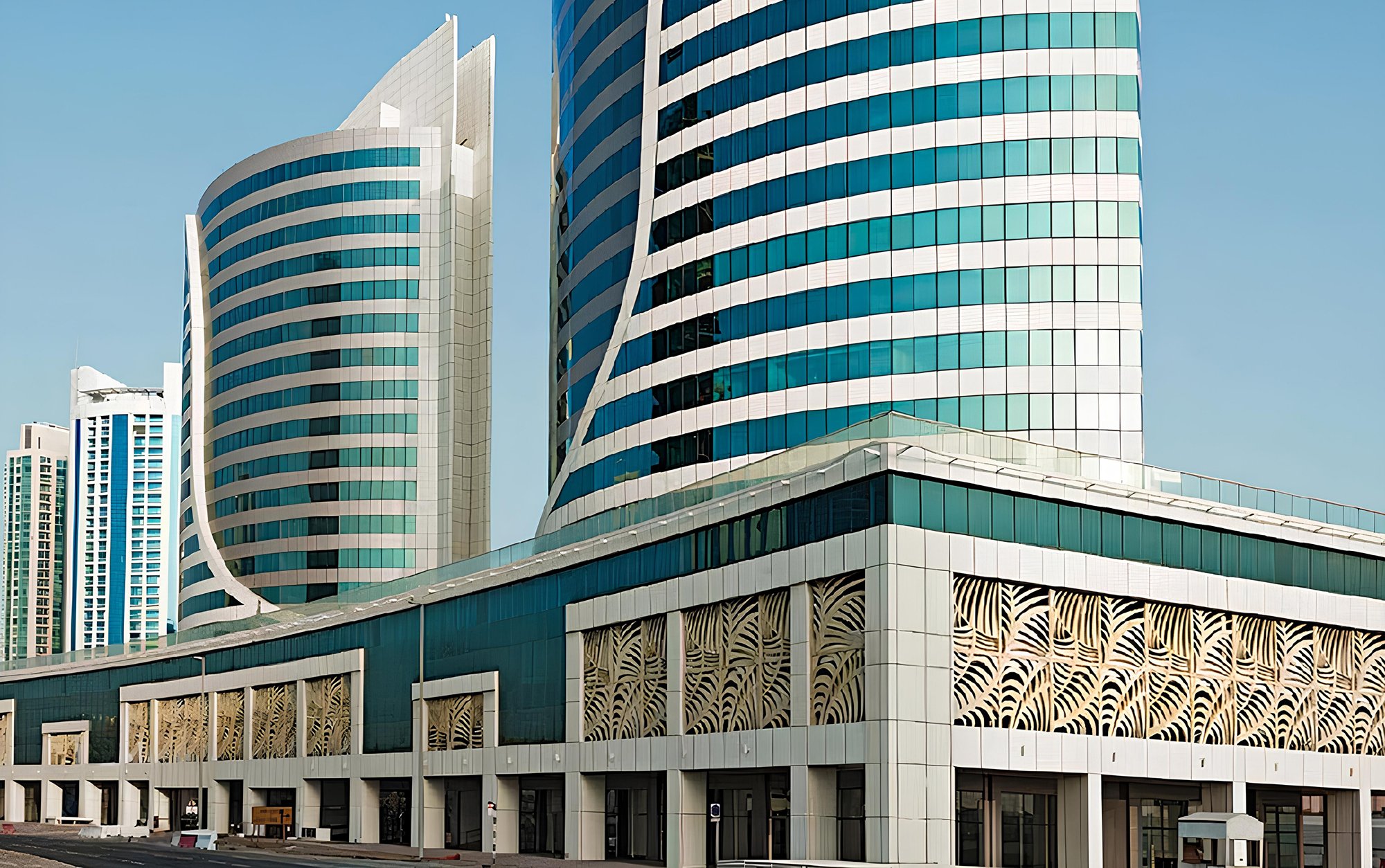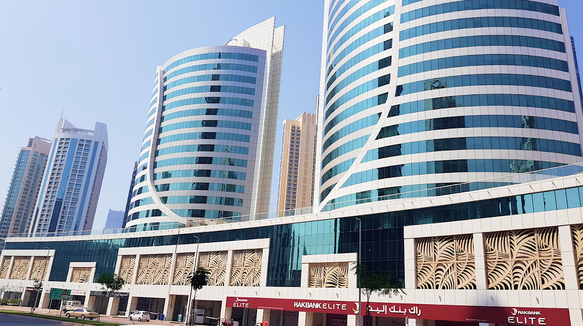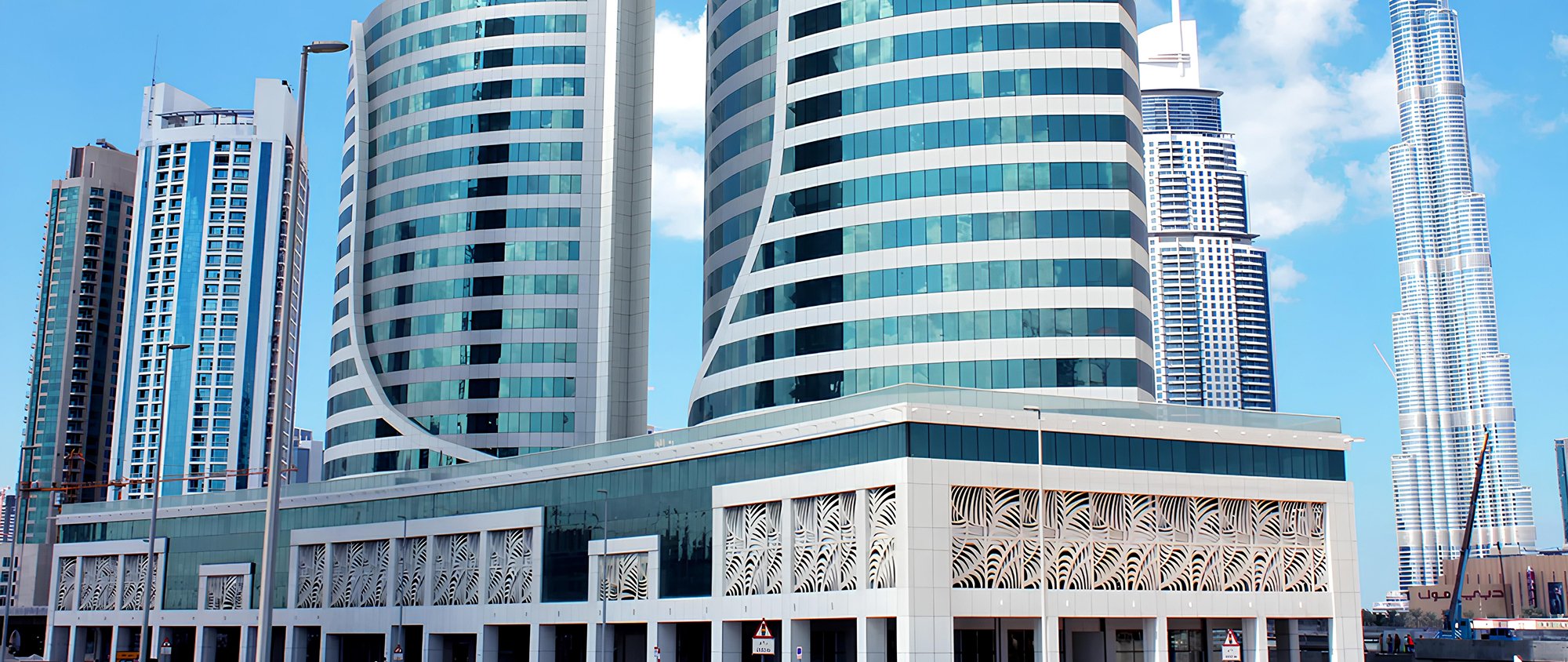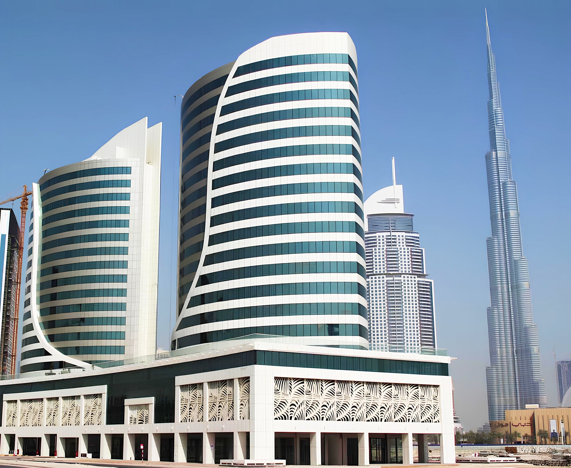 A fully operational business complex in the centre of Business Bay — two towers sharing a landscaped podium with retail, dining and everything a modern office tenant needs
